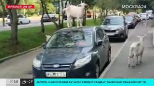 В Москве коза использовала припаркованный автомобиль как опору для того, чтобы дотянуться до листьев на...