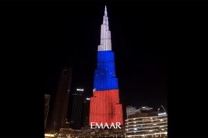 Бурдж-Халифа, одна из самых известных достопримечательностей Дубая и самое высокое здание мира, окрасилось в цвета...