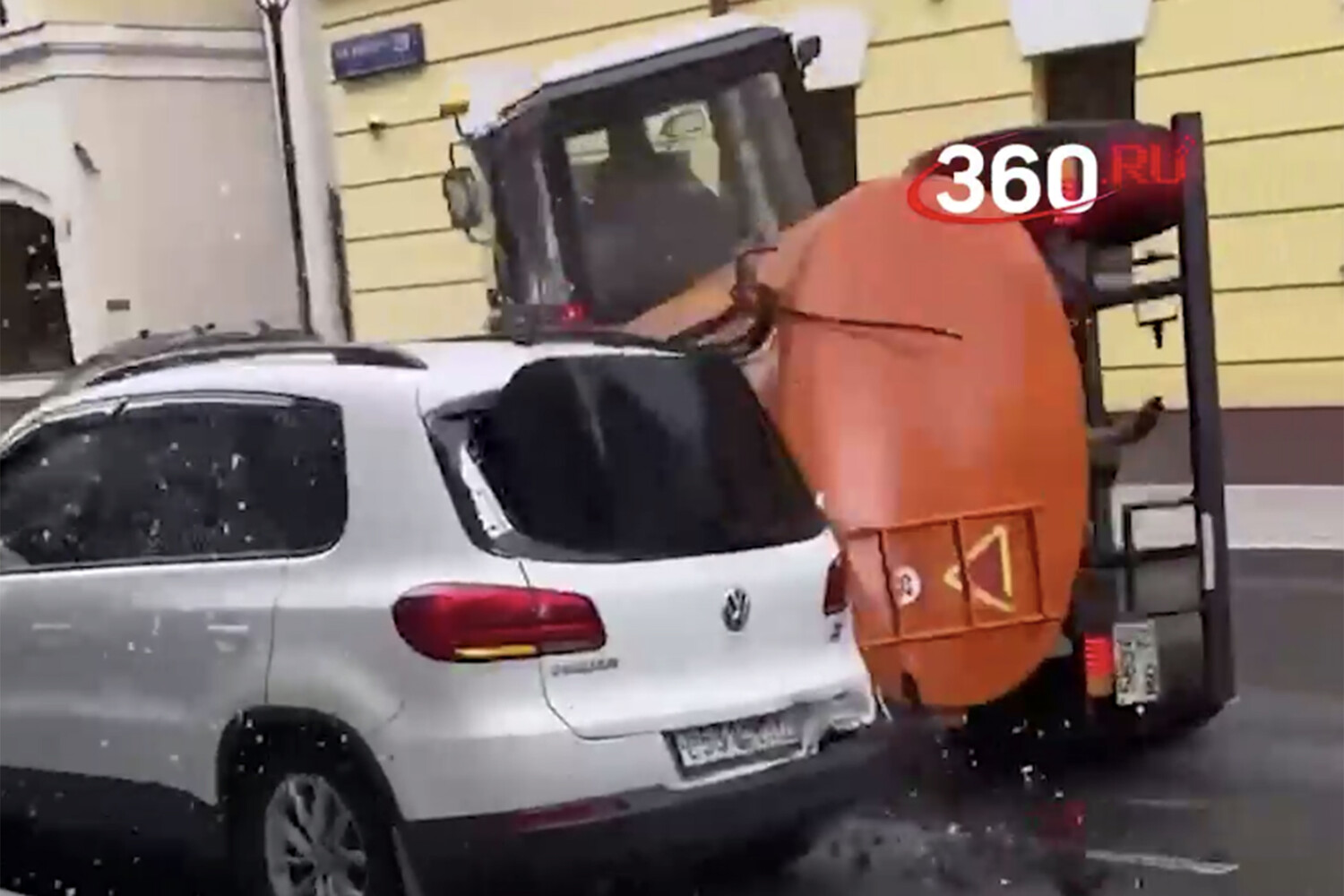В центре Москвы трактор столкнулся с припаркованными автомобилями, сообщает Telegram-канал «360 ЧП». Инцидент произошел в Басманном районе, когда трактор с водяным баком потерял управление на повороте.