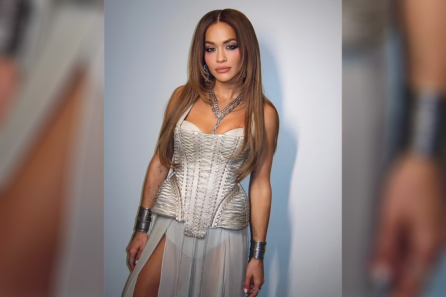 В мае публика увидела Риту в изящном серебристом атласном корсете со шнуровкой в сочетании с серой прозрачной юбкой с разрезом до бедра. Украшениями к наряду стали серьги, массивное колье-цепь, браслеты и кольца.