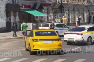 В центре Москвы затруднено движение транспорта в связи с аварией, в которой участвовали такси и...