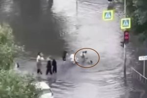 Во время сильного дождя в Тюмени девушка, переходившая улицу, оказалась под водой на пешеходном переходе....