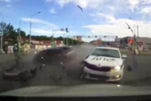 В Приморском крае камера видеорегистратора зафиксировала момент аварии с патрульной машиной ДПС, о чем сообщил...