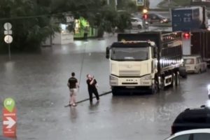 После мощного ливня в Новосибирске на затопленной улице появились рыбаки, о чем сообщает Telegram-канал ACT-54...